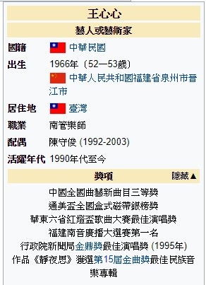 王心心(1966年-)生長於福建泉州晉江市,是當代華人最重要的南管音樂家之一,精習指、譜大曲及各項樂器,尤以歌唱著名,是南管界少見「坐遍五張金交椅」的音樂全才。曾任福建泉州南音樂團專職樂師和漢唐樂府南管古樂團的音樂總監,並於2003年創立心心南管樂坊,致力於南管古樂在當代的傳承與發揚[1][2]。 曾受邀於法國「亞維農藝術節」、德國「碧娜鮑許國際舞蹈節」、比利時「法蘭德斯藝術節」、荷蘭「東亞之音」、溫哥華「世界音樂節」、舊金山「世界音樂節」、法國及葡萄牙「東方藝術節」、法國巴黎參議院、小艇歌劇院、美國「紐約中華新聞文化中心」等全世界近百場演出[3]。