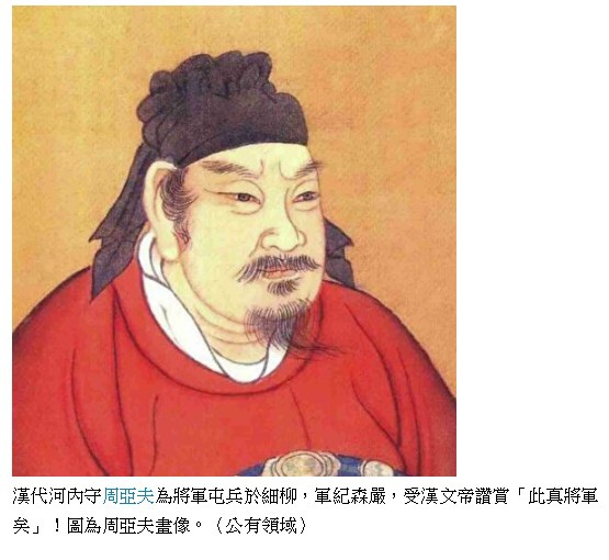 漢代河內守周亞夫為將軍屯兵於細柳,軍紀森嚴,受漢文帝讚賞「此真將軍矣」!圖為周亞夫畫像。(公有領域)