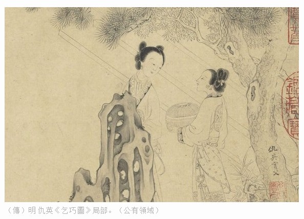 (傳)明 仇英《乞巧圖》局部。(公有領域)