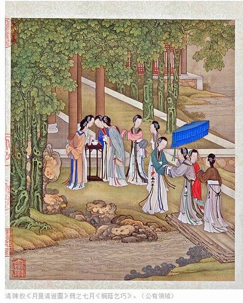 清 陳枚《月曼清遊圖》冊之七月《桐蔭乞巧》。(公有領域)