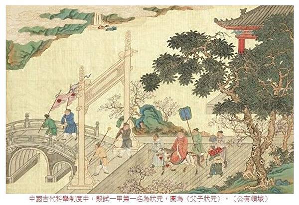 中國古代科舉制度中,殿試一甲第一名為狀元。圖為《父子狀元》。(公有領域)