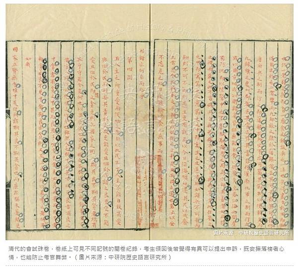 清代的會試硃卷,卷紙上可見不同記號的閱卷紀錄,考生領回後若覺得有異可以提出申訴,既安撫落榜者心情,也能防止考官舞弊。(圖片來源:中研院歷史語言研究所)