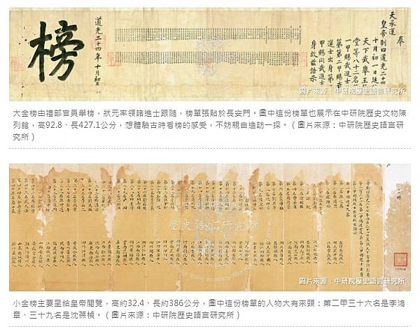 大金榜由禮部官員舉榜,狀元率領諸進士跟隨,榜單張貼於長安門。圖中這份榜單也展示在中研院歷史文物陳列館,高92.8、長427.1公分,想體驗古時看榜的感受,不妨親自造訪一探。(圖片來源:中研院歷史語言研究所)