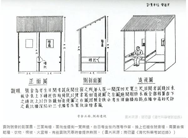 貢院號舍的剖面圖,三面有牆,面向走道側一覽無遺。白日考生在內應考作答,晚上也睡在號舍裡,需要自備乾糧、衣物、棉被、火盆等,有些貢院天寒時會提供熱粥。(圖片來源:商衍鎏《清代科舉考試述錄》)