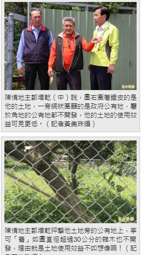 陳情地主鄒增乾(中)說,圖右圍著鐵皮的是他的土地,一旁網狀圍籬的是政府公有地,屬於角地的公有地都不開發,他的土地的使用效益可見更低。(記者黃美珠攝)