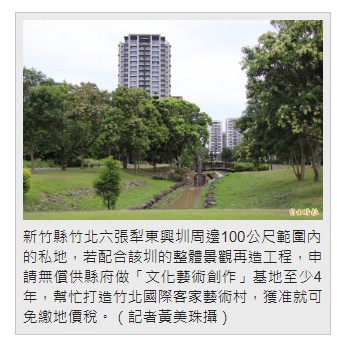 新竹縣竹北六張犁東興圳周邊100公尺範圍內的私地,若配合該圳的整體景觀再造工程,申請無償供縣府做「文化藝術創作」基地至少4年,幫忙打造竹北國際客家藝術村,獲准就可免繳地價稅。(記者黃美珠攝)