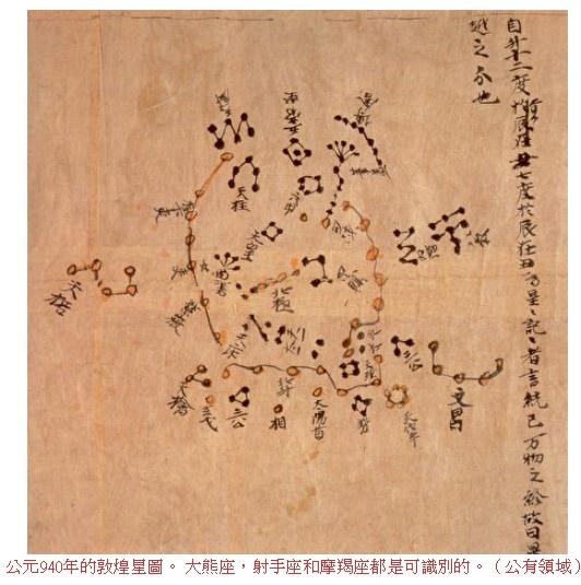 公元940年的敦煌星圖。 大熊座,射手座和摩羯座都是可識別的。(公有領域)