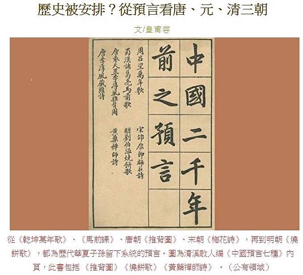 從《乾坤萬年歌》、《馬前課》、唐朝《推背圖》、宋朝《梅花詩》,再到明朝《燒餅歌》,都為歷代華夏子孫留下系統的預言。圖為清溪散人編《中國預言七種》內頁,此書包括 《推背圖》《燒餅歌》《黃蘗禪師詩》 。(公有領域)