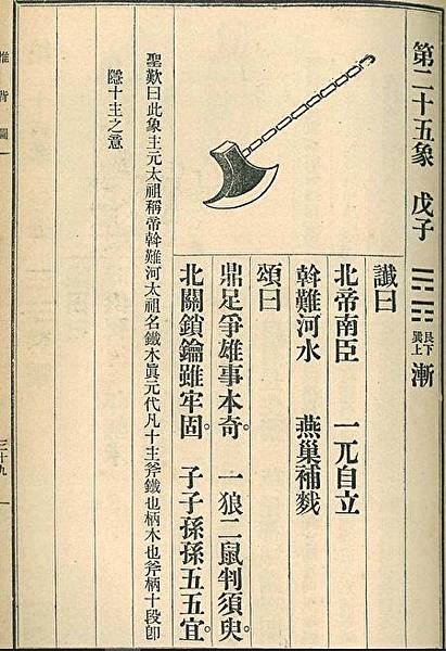 《推背圖》二十五象預言了元太祖及整個元朝國運。圖讖為:畫中一把鐵斧,斧柄分為十節。斧頭為鐵,斧柄為木,以此喻示元太祖名諱鐵木真。斧柄十節,意為元朝十帝。圖畫簡潔,清晰明了,僅以寥寥線條就勾勒出整座王朝氣數。預言智慧之高,喻示方式之巧,令後世驚歎。讖語曰: