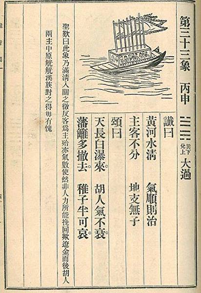 《推背圖》十到十四象,說的是五代;十五到二十象講的是北宋;二十一至二十四象預言南宋;二十五和二十六象預言元朝:二十七至三十二象講的是明朝:三十三象至三十六象預言清朝。對於中國最後一個王朝清朝,《推背圖》第三十三象讖語曰: