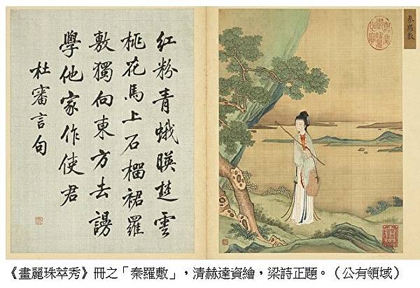 《畫麗珠萃秀》冊之「秦羅敷」,清赫達資繪,梁詩正題。(公有領域)