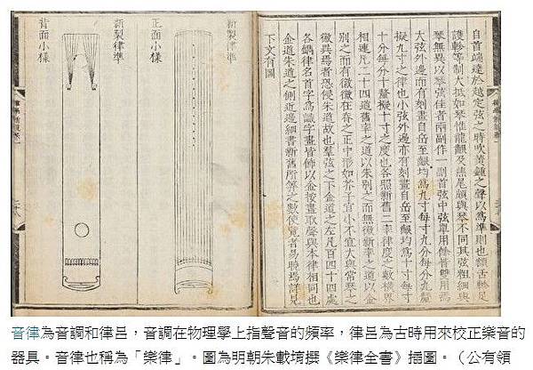 音律為音調和律呂,音調在物理學上指聲音的頻率,律呂為古時用來校正樂音的器具。音律也稱為「樂律」。圖為明朝朱載堉撰《樂律全書》插圖。(公有領域)