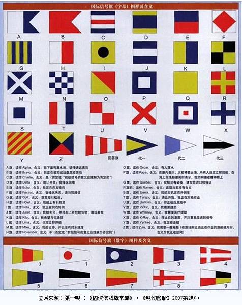 圖片來源:張一鳴 :《國際信號旗常識》,《現代艦船》2007第2期。 圖片來源:張一鳴 :《國際信號旗常識》,《現代艦船》2007第2期。