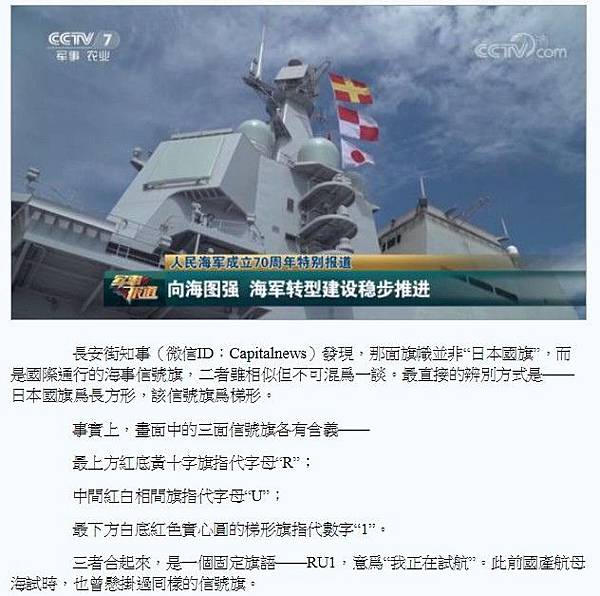 中共海軍23日成立70週年前夕,「央視軍事報導」微信公號披露了中國首艘國產航艦的最新進展,其中一個鏡頭引發不少大陸網民的疑問:「國產航母(航艦)的艦島上為何會懸掛著日本國旗?」
