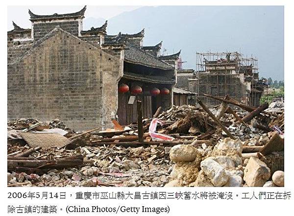 2006年5月14日,重慶市巫山縣大昌古鎮因三峽蓄水將被淹沒。工人們正在拆除古鎮的建築。(China Photos/Getty Images)