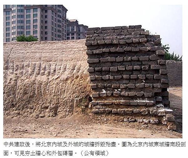 中共建政後,將北京內城及外城的城牆拆毀殆盡。圖為北京內城東城牆南段剖面,可見夯土牆心和外包磚層。(公有領域)