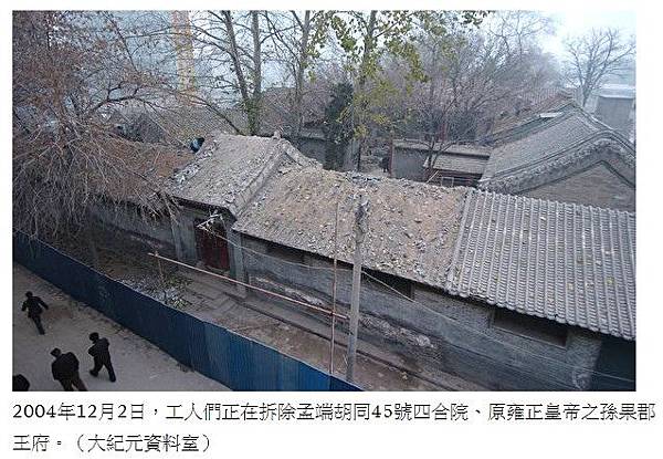 2004年12月2日,工人們正在拆除孟端胡同45號四合院、原雍正皇帝之孫果郡王府。(大紀元資料室)