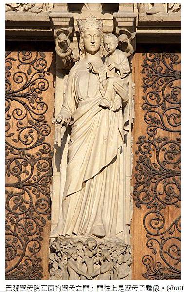 巴黎聖母院正面的聖母之門,門柱上是聖母子雕像。(shutterstock)