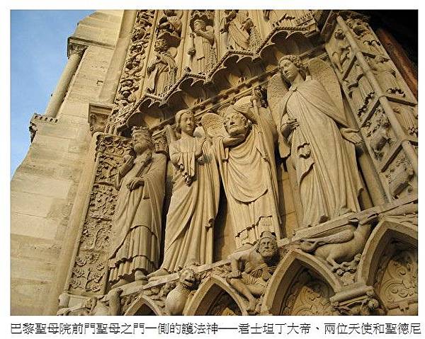 巴黎聖母院前門聖母之門一側的護法神——君士坦丁大帝、兩位天使和聖德尼。(Olivier Bruchez/Wikimedia Commons)