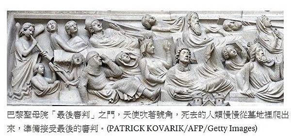 巴黎聖母院「最後審判」之門,天使吹著號角,死去的人類慢慢從墓地裡爬出來,準備接受最後的審判。(PATRICK KOVARIK/AFP/Getty Images)