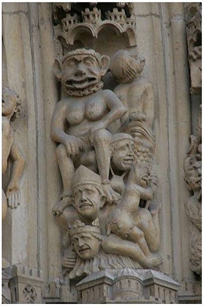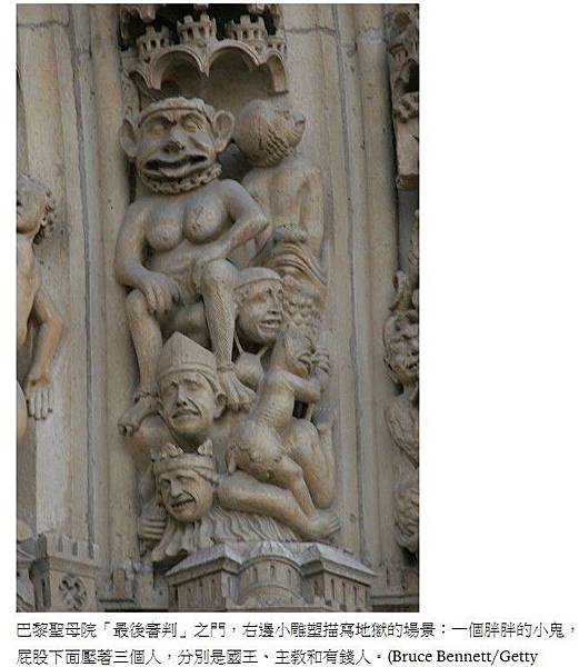 巴黎聖母院「最後審判」之門,右邊小雕塑描寫地獄的場景:一個胖胖的小鬼,屁股下面壓著三個人,分別是國王、主教和有錢人。(Bruce Bennett/Getty Images)