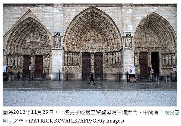 圖為2012年11月29日,一名男子經過巴黎聖母院三個大門。中間為「最後審判」之門。(PATRICK KOVARIK/AFP/Getty Images)