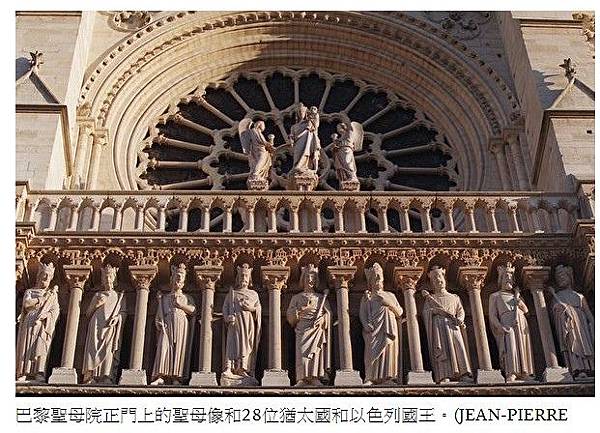 花窗下面一整排,是大衛、摩西、所羅門等28位猶太國和以色列的國王。這些雕像在法國大革命時期遭到砍頭,直到19世紀中葉才重新雕刻安上。近200年後的1977年,人們發現了頭顱集中埋葬的地方,其中21個頭顱基本完好。