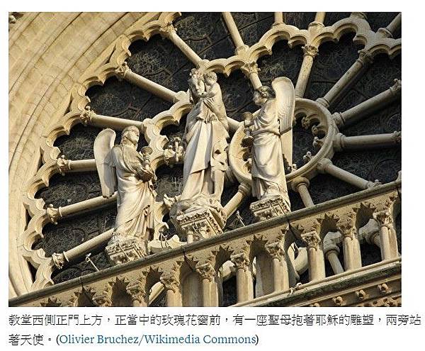 教堂西側正門上方,正當中的玫瑰花窗前,有一座聖母抱著耶穌的雕塑,兩旁站著天使。(Olivier Bruchez/Wikimedia Commons)
