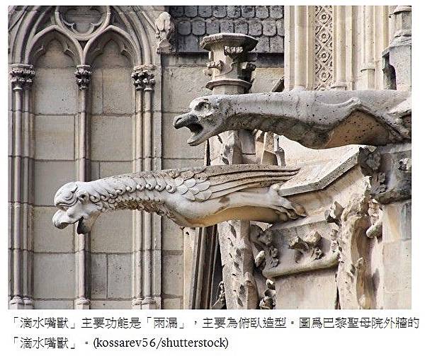 「滴水嘴獸」主要功能是「雨漏」,主要為俯臥造型。圖爲巴黎聖母院外牆的「滴水嘴獸」。(kossarev56/shutterstock)