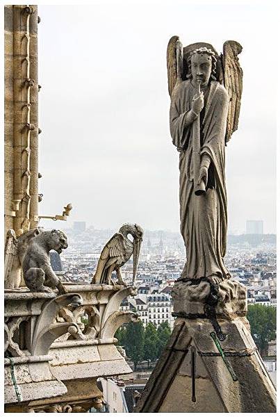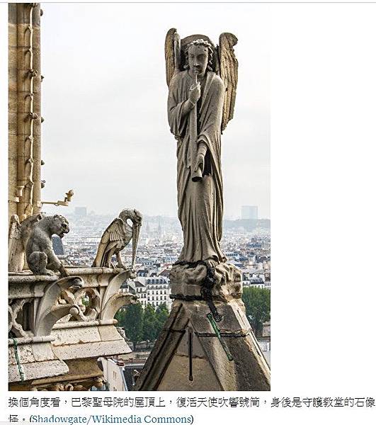 換個角度看,巴黎聖母院的屋頂上,復活天使吹響號筒,身後是守護教堂的石像怪。(Shadowgate/Wikimedia Commons)