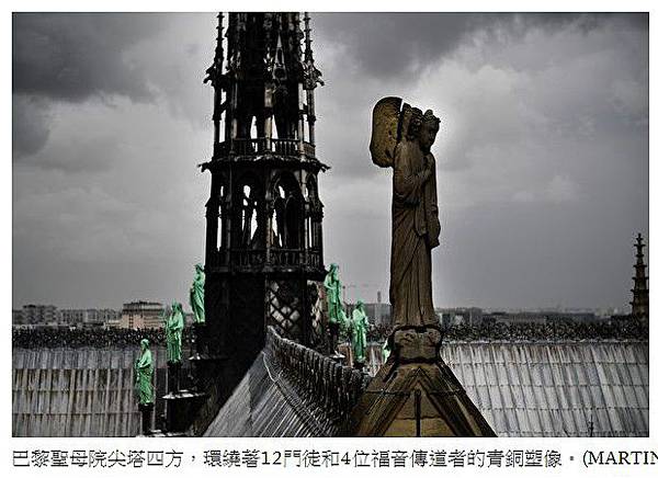巴黎聖母院尖塔四方,環繞著12門徒和4位福音傳道者的青銅塑像。(MARTIN BUREAU/AFP/Getty Images)