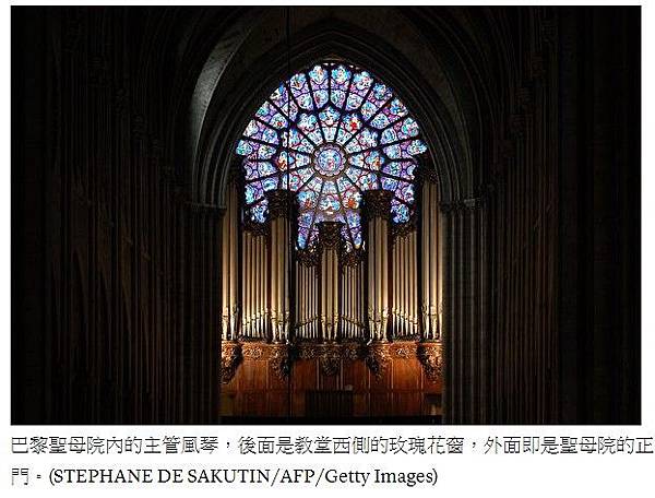 巴黎聖母院內的主管風琴,後面是教堂西側的玫瑰花窗,外面即是聖母院的正門。(STEPHANE DE SAKUTIN/AFP/Getty Images)