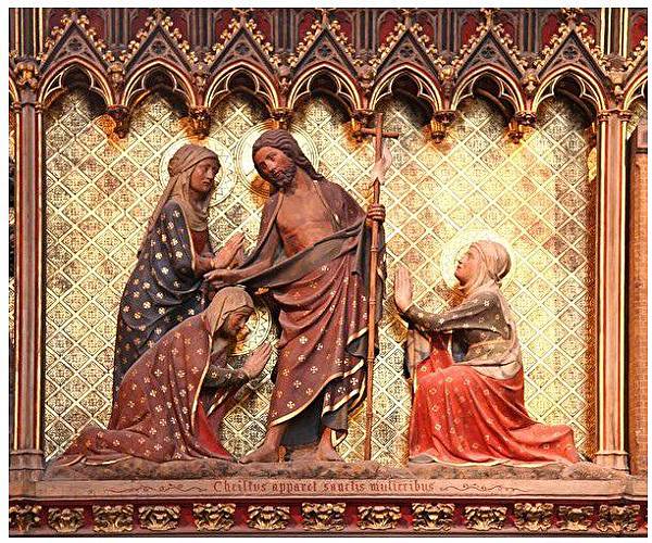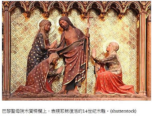 巴黎聖母院木質柵欄上,表現耶穌復活的14世紀木雕。(shutterstock)