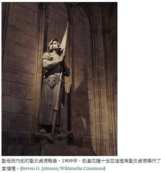 聖母院內部的聖女貞德雕像。1909年,教皇庇護十世在這裡爲聖女貞德舉行了宣福禮。(Steven G. Johnson/Wikimedia Commons)