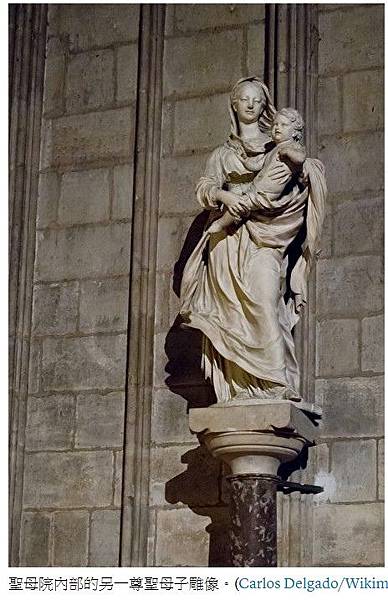 巴黎聖母院耳堂中完成於14世紀的聖母子雕像。(Sailko/Wikimedia Commons)