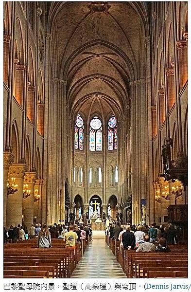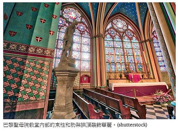 巴黎聖母院教堂內部的束柱和肋架拱頂裝飾華麗。(shutterstock)