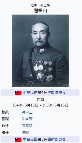 閻錫山(1883年10月8日-1960年5月23日),字百川、伯川,漢族,山西省五臺縣人,清末舉人,中華民國北洋政府將軍府同武上將軍,中華民國國軍(及其前身國民革命軍)陸軍一級上將,北洋軍閥晉系領袖,曾任行政院院長、國防部部長及總統府資政等職務,1949年11月20日至1950年3月1日代行時任代總統李宗仁職務,是中華民國行憲至今唯一一位代理總統職權、形同國家最高領導者的行政院長。閻錫山主政期間,其管轄之山西省自1911年辛亥革命後建立以來,經歷多場內戰、抗日戰爭及國共內戰依然屹立不倒,直至1949年4月太原戰役結束後被共軍佔領為止,一共歷經38年,是眾多軍閥中紀錄最長者。