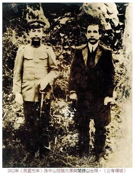 1912年(民國元年)孫中山蒞臨太原與閻錫山合照。(公有領域)