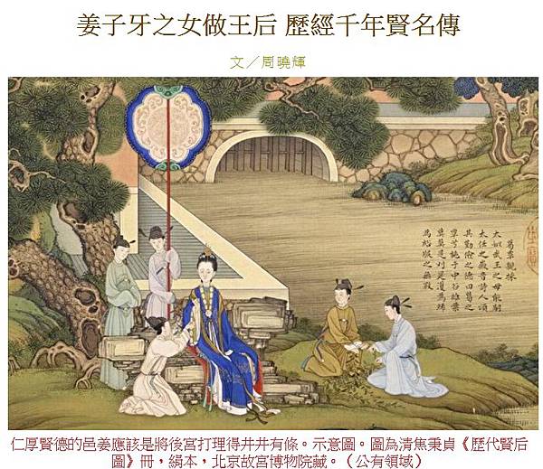 仁厚賢德的邑姜應該是將後宮打理得井井有條。示意圖。圖為清焦秉貞《歷代賢后圖》冊,絹本,北京故宮博物院藏。(公有領域)