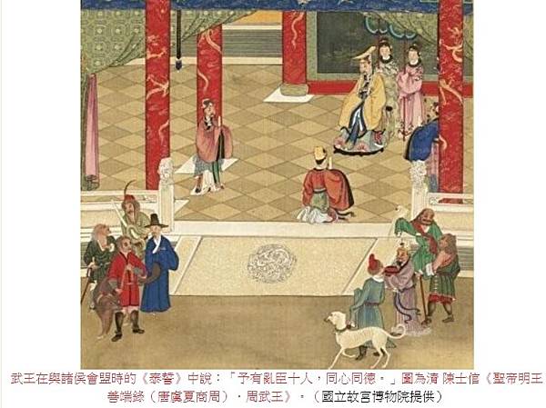 武王在與諸侯會盟時的《泰誓》中說:「予有亂臣十人,同心同德。」圖為清 陳士倌《聖帝明王善端錄(唐虞夏商周).周武王》。(國立故宮博物院提供)