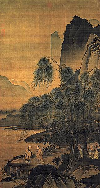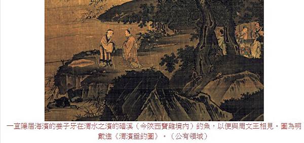 一直隱居海濱的姜子牙在渭水之濱的磻溪(今陝西寶雞境內)釣魚,以便與周文王相見。圖為明 戴進《渭濱垂釣圖》。(公有領域)