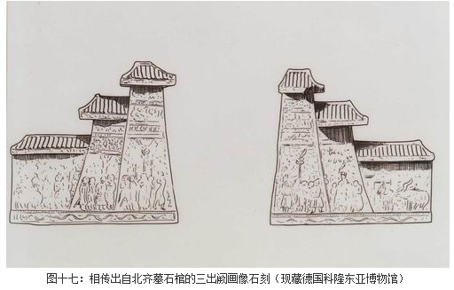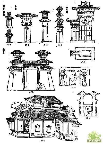 文獻中有關闕的記載頗多,如秦阿房宮即“表南山以為闕”,漢宮中有關長樂、未央、建章諸宮闕的敘述更是早已為人所盡知。《史記》載西漢“營未央宮,立東闕、北闕”,武帝時作建章宮,“其東側鳳闕高二十餘丈",《水經註》注此闕高七丈五尺,約合19米左右,相當高大。另在畫像磚、畫像石、建築明器中的形象亦有不少。保存至今的漢代門闕實物均為墓闕,除少量在河南、山東外,大部分集中於四川,年代多屬東漢