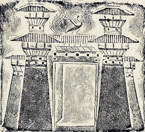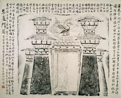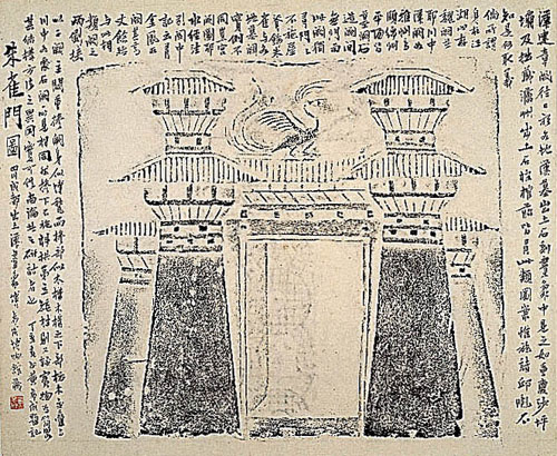 【著錄一】雙闕上有瓦瓴,檐下有椽柱,兩闕以桴思相連,上立一隻鳳鳥,因上面栖有一鳳,故又名鳳闕,在文獻記載和文人詩賦裡屢被歌頌。《關中記》:「建章宮闕臨北道,銅鳳在上,故號鳳闕。」班固《西都賦》:「設壁門之鳳闕,上觚棱而栖金爵。」李善注引《三輔故事》:「建章宮闕上有銅鳳,然則金爵即銅鳳也。」張衡《西京賦》:「圜闕竦以造天,若雙碣之相望。鳳騫翥於甍標,咸溯風而欲翔。」可以想見漢代的建築規模。 【著錄二】四川成都市郊出土漢畫像磚拓本。闕為漢代特殊的建築,圖中雙闕以桴思相連,上面立一鳳鳥,主闕之兩側扶以子闕。