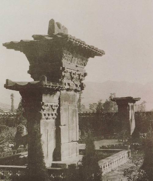 據文獻記載,其最早建於春秋時期,當時主要置於宮殿、寺廟、城門前,它既是宮殿的象徵,又是揭示政令和依托遠眺,以利防禦的地方。