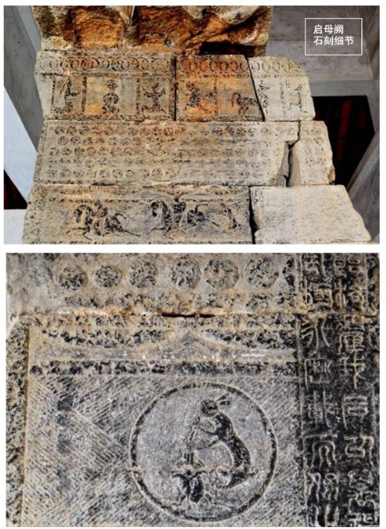 銘文間隙處及其他石塊上浮雕人物畫像、幻術、騎馬出行、鬥雞、馴象、吐火、進謁、倒立、飲宴、日御羲和、啟母化石、夏禹化熊、郭巨埋兒、月宮、蛟龍穿環、犬逐兔、果下馬、蹴鞠、鶴叨魚、虎撲鹿、孔甲畜龍等畫像70餘幅。