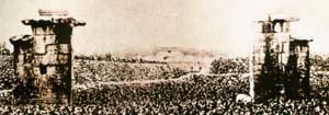 着献古代宮門外兩邊供瞭望的樓臺,中有通道。史記.卷八
