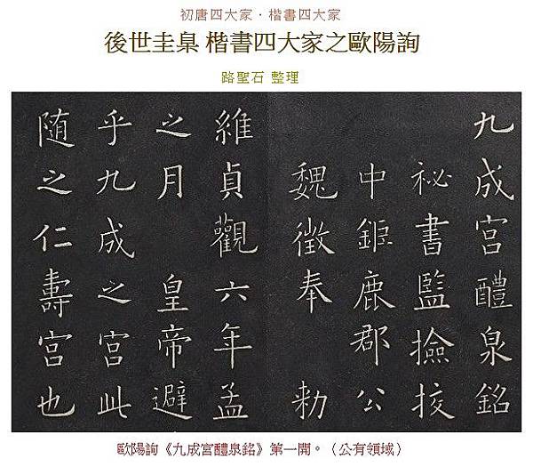 歐陽詢楷書法度之嚴謹,筆力之險峻,世無所匹。歐陽詢的正楷,源自古隸,以二王體為基礎,融合了漢隸和晉代楷書的特點,並參以六朝北派書風,結體特異,獨闢蹊徑,自成一家。