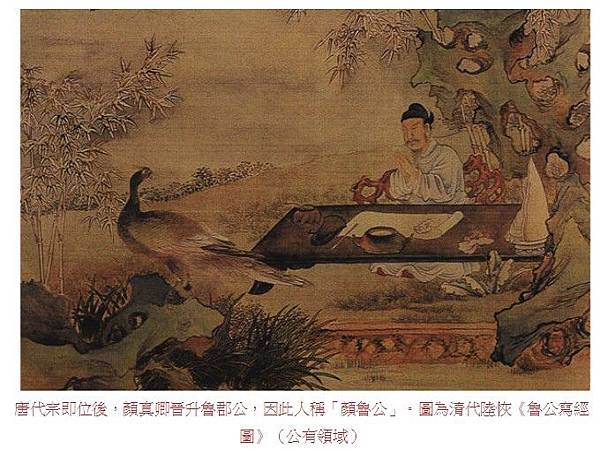 唐代宗即位後,顏真卿晉升魯郡公,因此人稱「顏魯公」。圖為清代陸恢《魯公寫經圖》(公有領域)