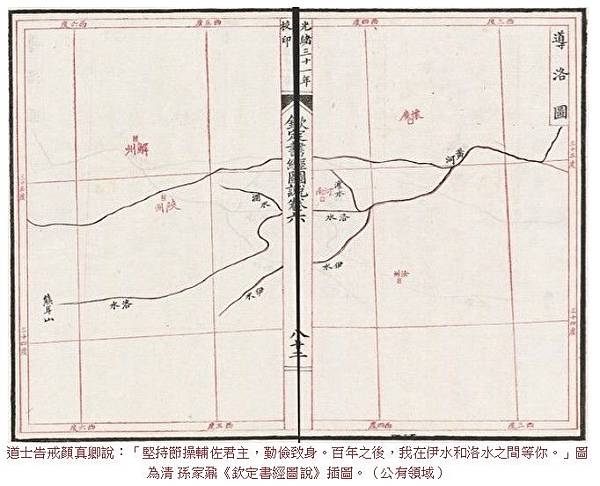 道士告戒顏真卿說:「堅持節操輔佐君主,勤儉致身。百年之後,我在伊水和洛水之間等你。」圖為清 孫家鼐《欽定書經圖說》插圖。(公有領域)