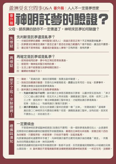 新北蘆洲受玄宮特別製作圖表,透過「先懷疑」、「再懷疑」、「受不了來驗證」3步驟來驗證神明的託夢。圖/翻攝蘆洲受玄宮臉書